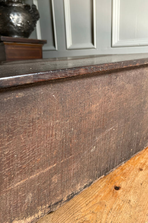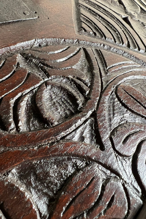 18th century oak bible or desk box with relief carving to the front.