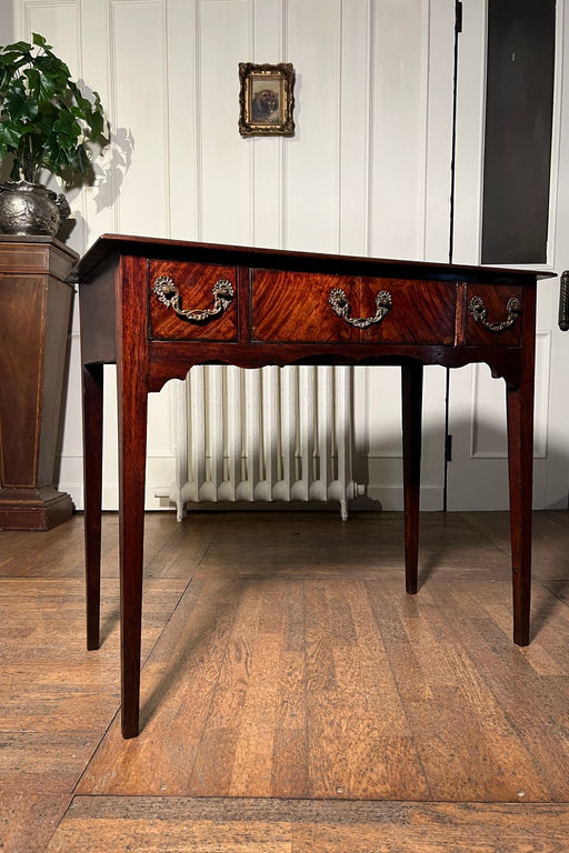 Scroll front apron below 3 finely crossbanded drawers with Chippendale style pulls.