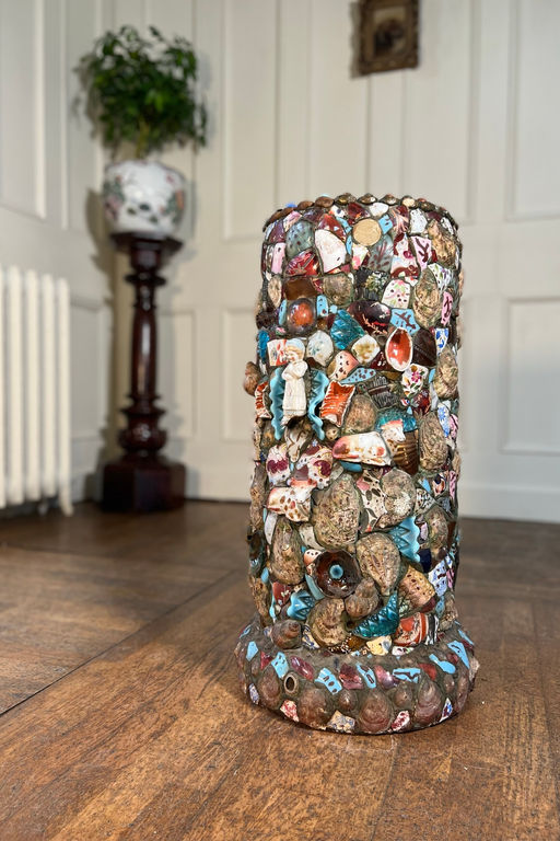 Originally seems to have started life as a chimney pot this has been decorated in the pique assiette style using old broken ceramics and shells.