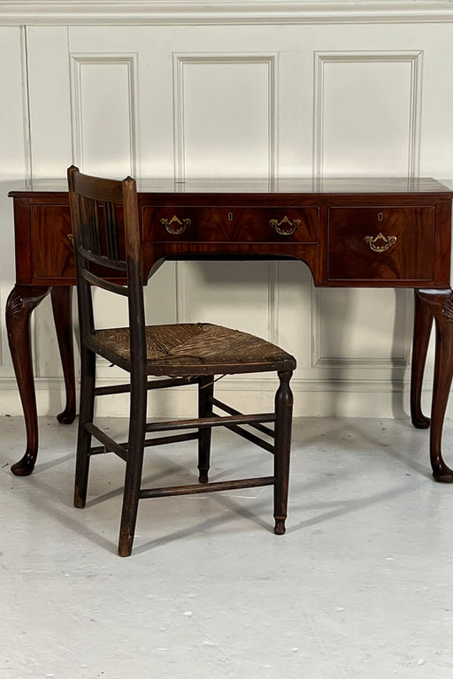 Solid mahogany top above three desk drawers standing on Queen Anne legs boasting shell motifs.
